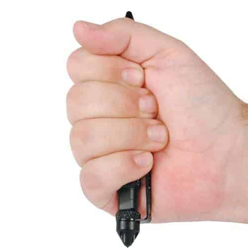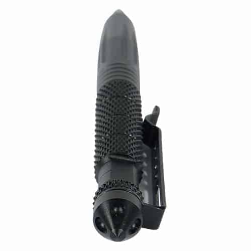 Tactical Black Twist Pen with Extra Refill. This pen has a black finished textured aluminum body for easy grip with glass breaker tip and a pocket clip for easy carry. It has a retractable pen tip, twist to open and close. Writes well and comes with a replacement pen ink cartridge. It can be used in a self-defense situation to jab or stab. Pen Measures 6 1⁄4″ x 1⁄2″